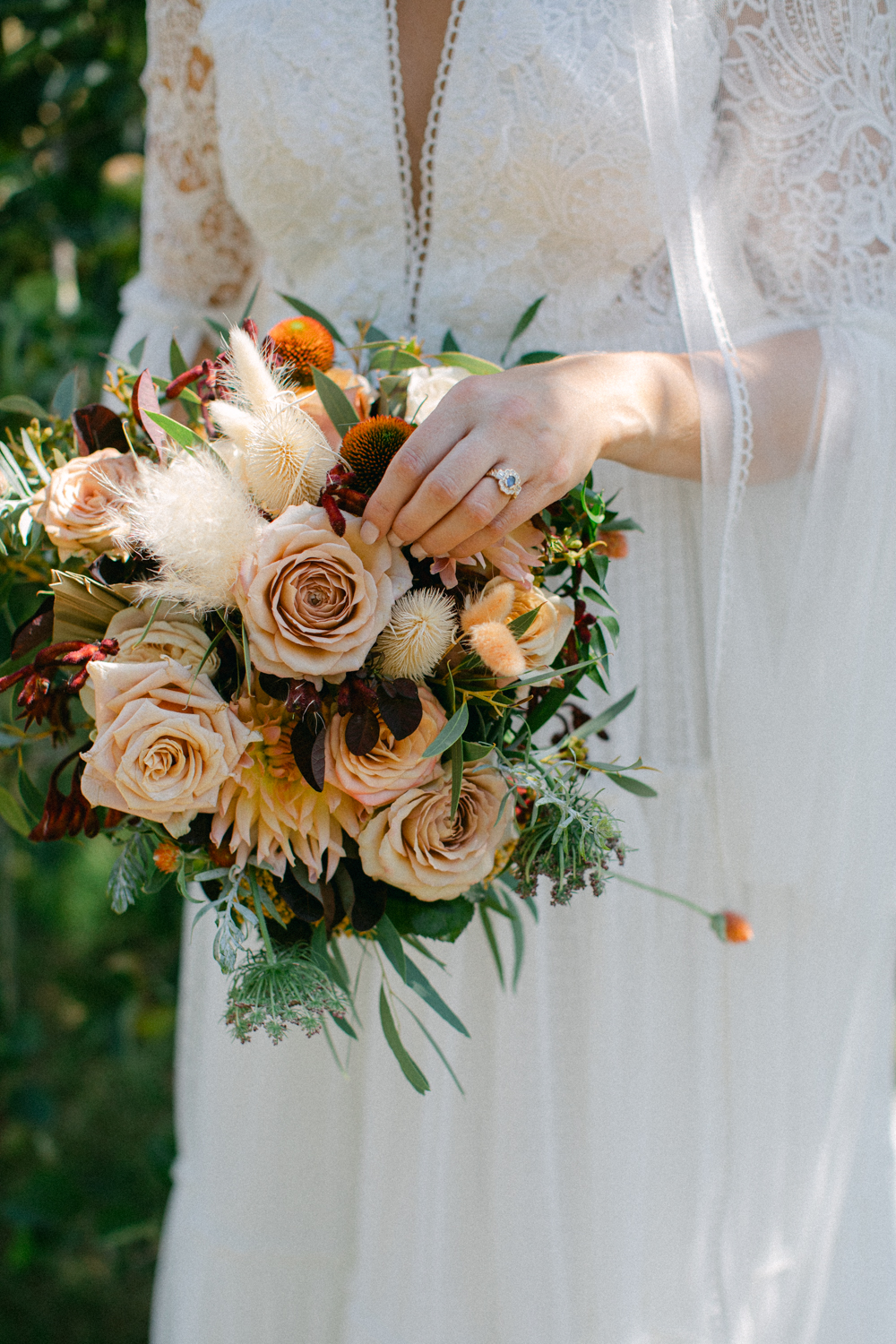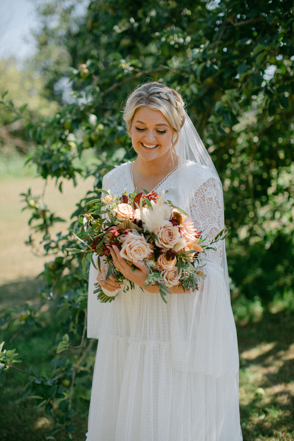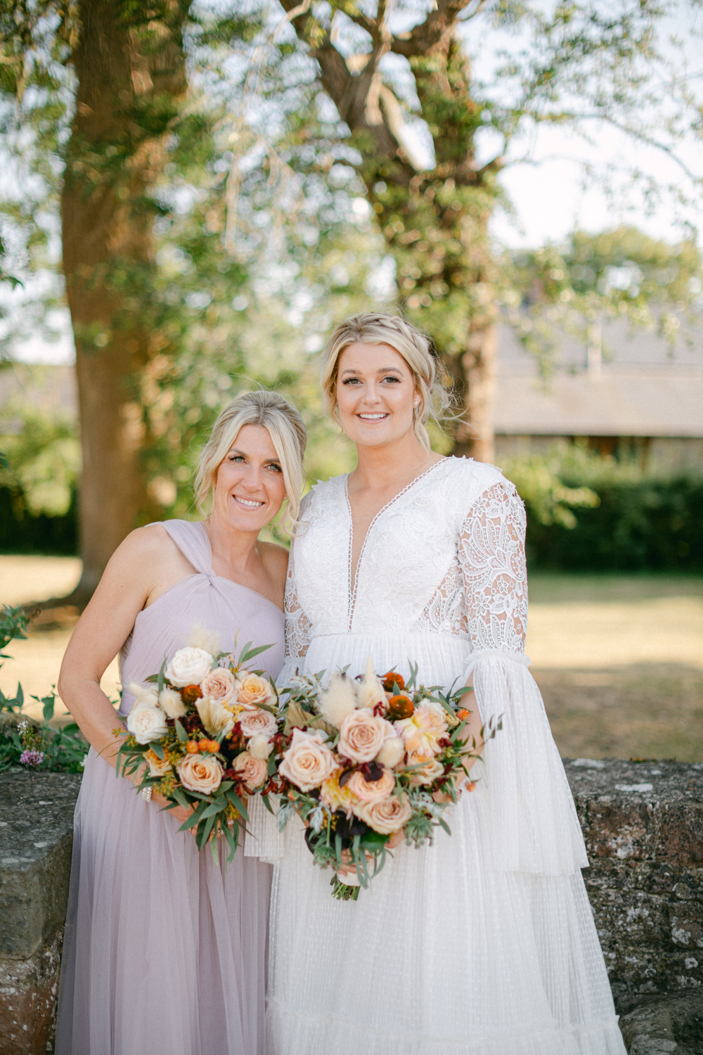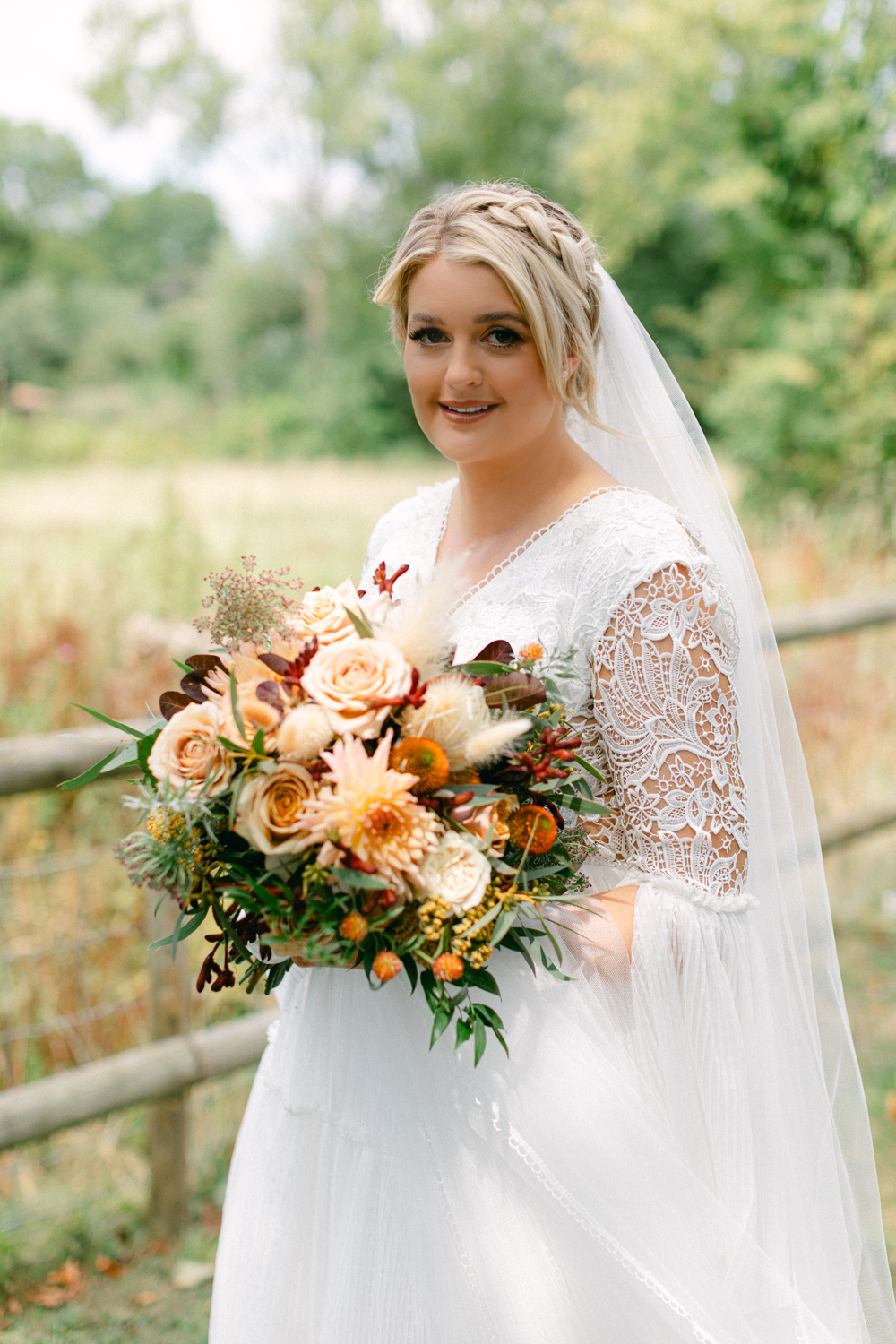 Meanwhile, Emma looked radiant in her romantic lace gown, with delicate sleeves and soft flowing layers that moved effortlessly in the summer breeze. Her bouquet of warm-toned florals added a subtle autumnal richness, complementing the countryside setting perfectly.