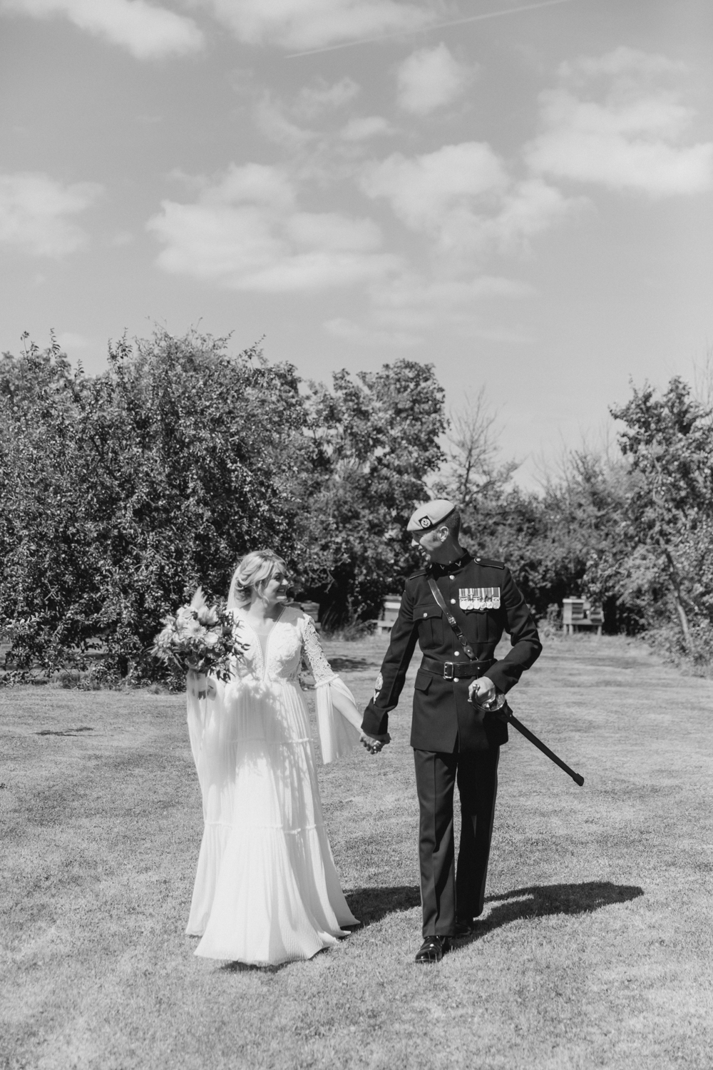 No military wedding would be complete without a Guard of Honour. As the ceremony concluded, the little pathway leading to the church gate became the perfect setting for this iconic tradition. Swords were raised in salute as Emma and Matthew walked through the arch, surrounded by cheers, laughter and a shower of confetti from waiting guests and villagers.