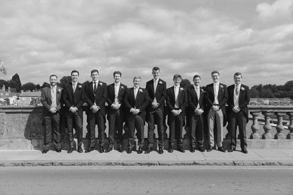 In keeping with the relaxed elegance of the day, guests boarded boats along the Thames to travel to the reception venue. Meanwhile, Hugh had earlier arrived at the church by boat with his groomsmen — stopping for a group photograph on the bridge, which perfectly captured their camaraderie and the spirit of the morning.